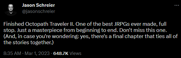 So, where does that leave me with Octopath Traveler 2? What are my concluding thoughts on this crazy game, in what might be my longest review yet?